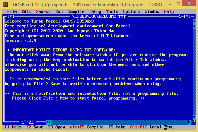 Turbo pascal (with dosbox) (tpwdb) is a free and open source compiler and integrated development environment (ide) for pascal language on windows 64 bit and 32 bit... . Turbo pascal (with dosbox) (tpwdb) is a free and open source compiler and integrated development environment (ide) for pascal language on windows 64 bit and 32 bit.
